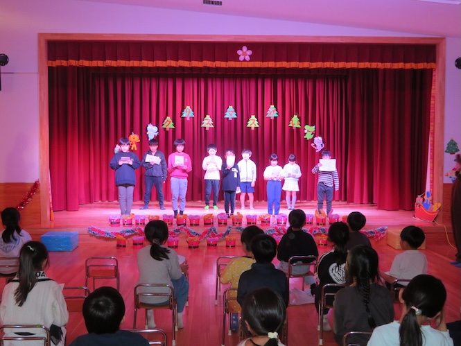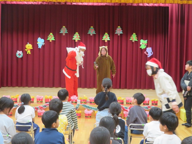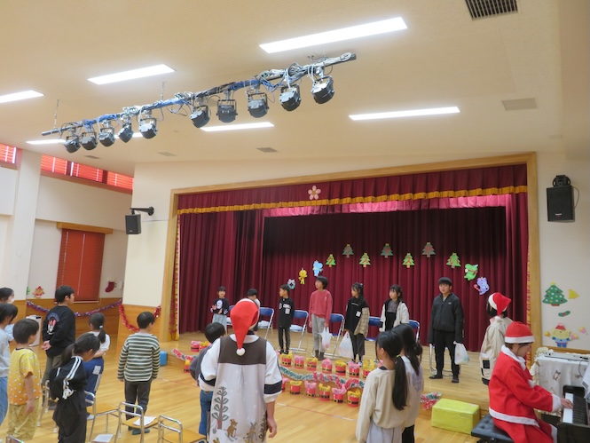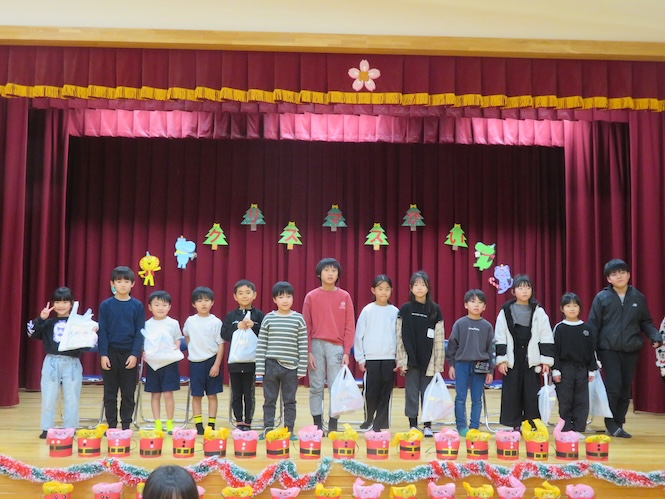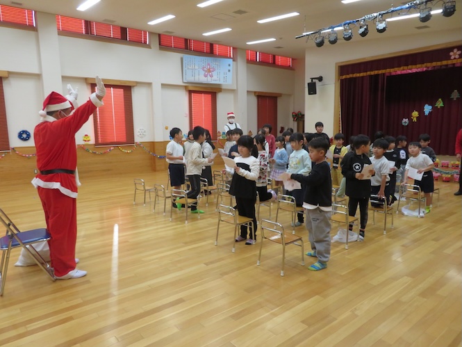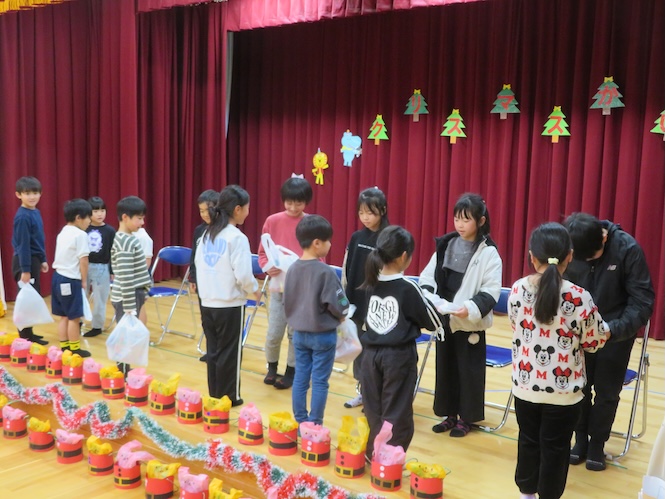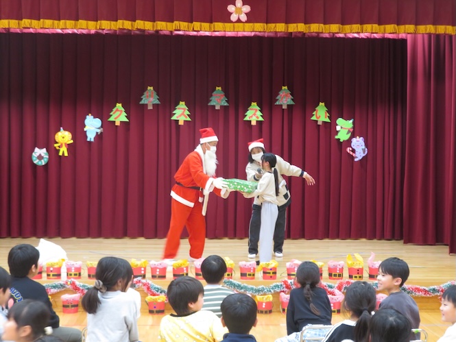 代表の児童がサンタさんからプレゼントをいただきました(^▽^)/