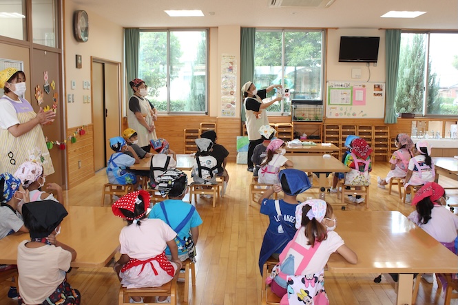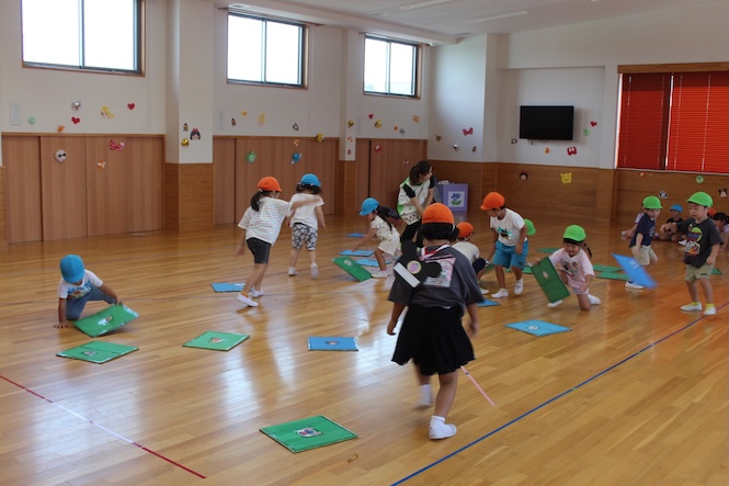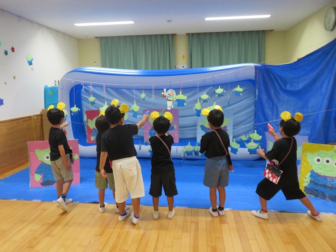 2歳児のお部屋は、水鉄砲でリトルグリーンメンをやっつけます!!