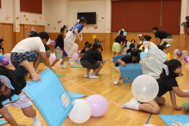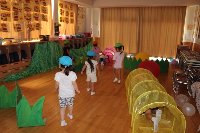 2歳児親子競技では、おうちの方と一緒にシャングル探検へGO!!